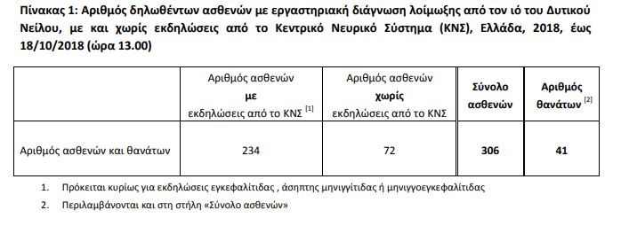 Όπως προκύπτει από τον μέχρι τώρα απολογισμό του ΚΕΕΛΠΝΟ, ο αριθμός των κρουσμάτων είναι 306, εκ των οποίων τα 41 ήταν θανατηφόρα. Οι ασθενείς είναι ηλικίας 10 έως 95 χρόνων και οι νεκροί στη συντριπτική τους πλειονότητα ηλικίας άνω των 70 χρόνων.