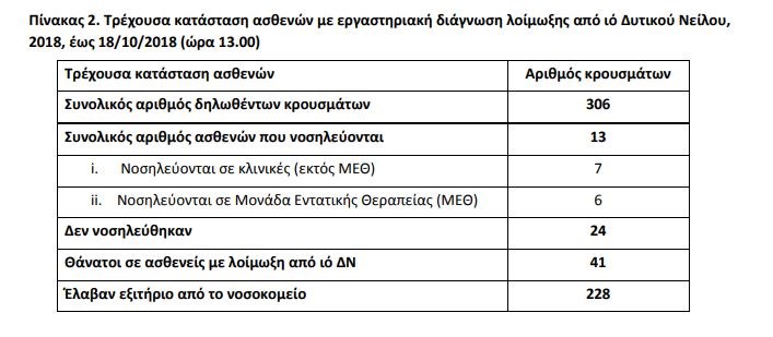Όπως προκύπτει από τον μέχρι τώρα απολογισμό του ΚΕΕΛΠΝΟ, ο αριθμός των κρουσμάτων είναι 306, εκ των οποίων τα 41 ήταν θανατηφόρα. Οι ασθενείς είναι ηλικίας 10 έως 95 χρόνων και οι νεκροί στη συντριπτική τους πλειονότητα ηλικίας άνω των 70 χρόνων.