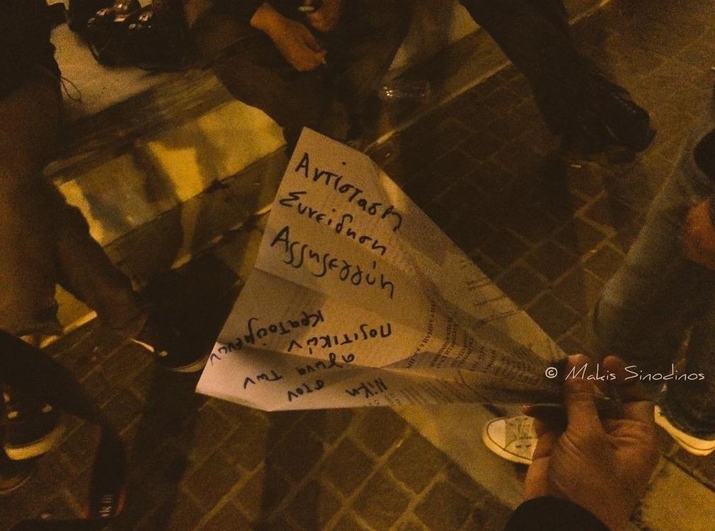 Έναν πρωτότυπο τρόπο έχουν βρει οι καταληψίες της Πρυτανείας, ώστε να στέλνουν τα μηνύματα που θέλουν στους συγκεντρωμένους και στους δημοσιογράφους. Όπως φαίνεται και στις φωτογραφίες, που ανέβασε στον προσωπικό του λογαριασμό στο Twitter ο δημοσιογράφος, Μάκης Συνοδινός, οι καταληψίες χρησιμοποιούν σαΐτες, πάνω στις οποίες είναι γραμμένα όσα θέλουν να μεταφέρουν προς τα έξω.