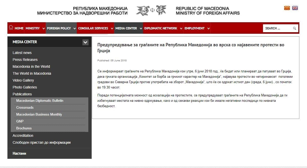Στην ανακοίνωση του το υπουργείο Εξωτερικών των Σκοπίων ενημερώνει τους πολίτες της γειτονικής χώρας για τα συλλαλητήρια ενάντια στη χρήση του όρου «Μακεδονία».