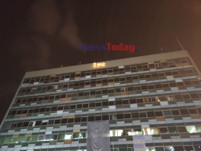 Το σύνθημα “1312” κατά των αστυνομικών ανήρτησαν φοιτητές στην κορυφή του κτιρίου διοίκησης της πρυτανείας του ΑΠΘ.