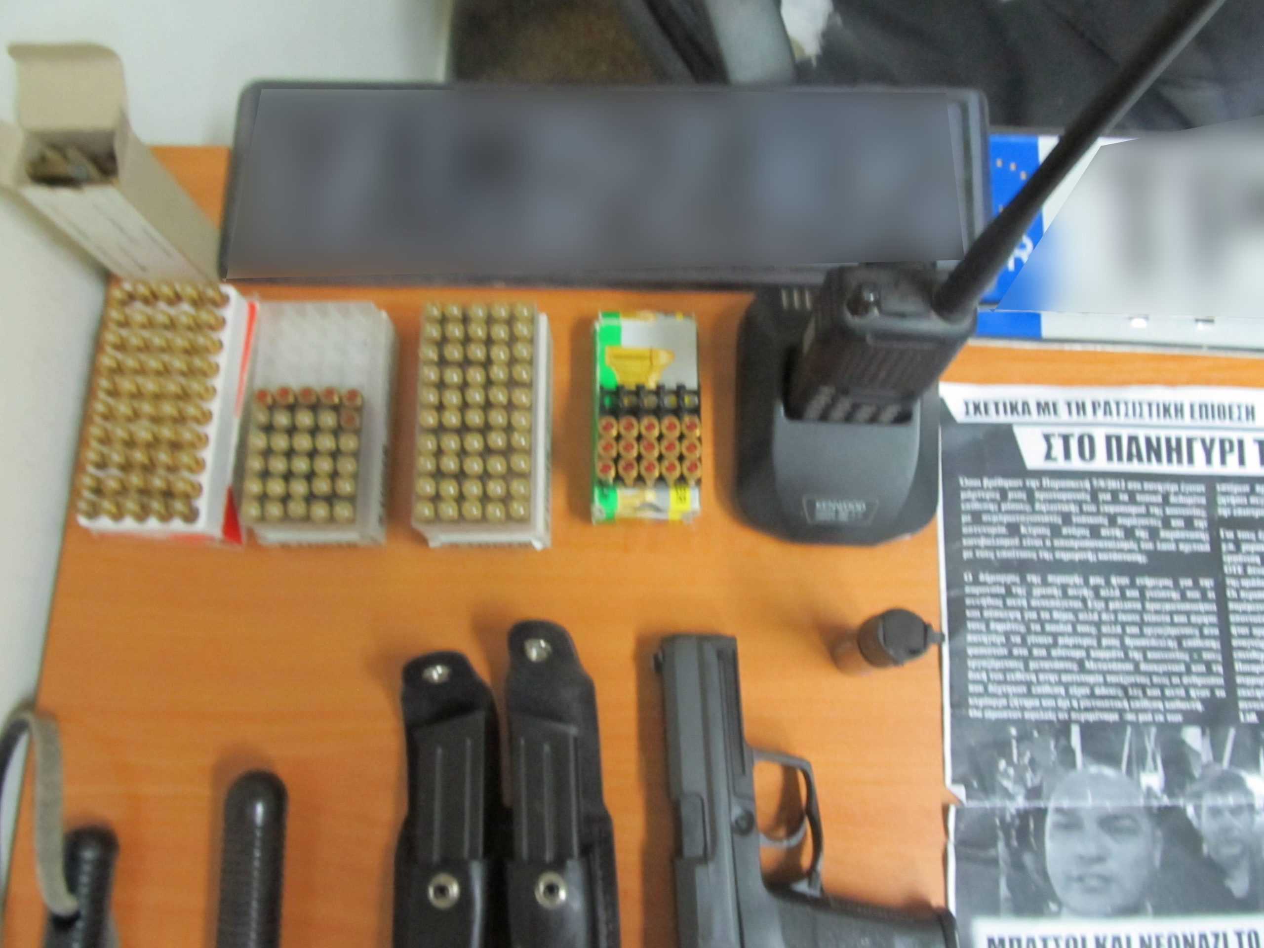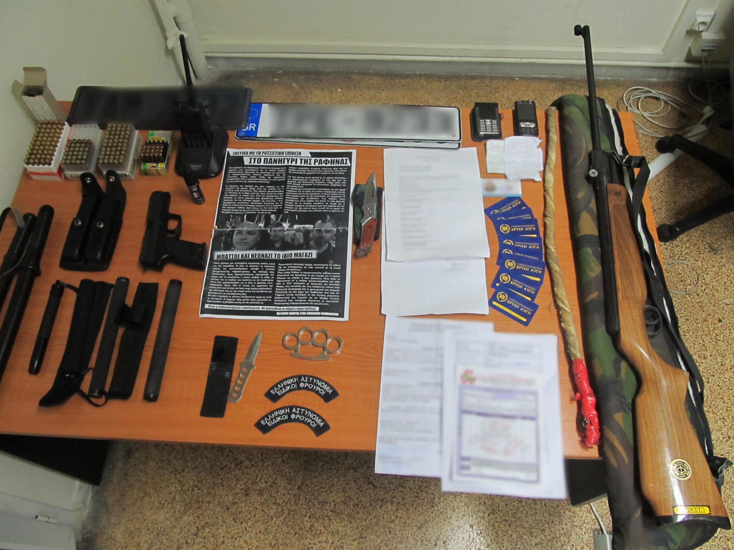 Σύμφωνα με ανακοίνωση της Αστυνομίας, χθες πραγματοποιήθηκαν νομότυπες έρευνες, στο σπίτι του ανθυπαστυνόμου, ο οποίος υπηρετεί σε Υπηρεσία της Αττικής, όπου βρέθηκαν και κατασχέθηκαν: τέσσερις πτυσσόμενοι μεταλλικοί ράβδοι και μία σιδερογροθιά, μία δερμάτινη θήκη με δύο μεταλλικούς γεμιστήρες πιστολιού, ένα σπρέι εκτόξευσης πιπεριού και ένα μαχαίρι με μήκος λάμας 6,5 εκατοστών.