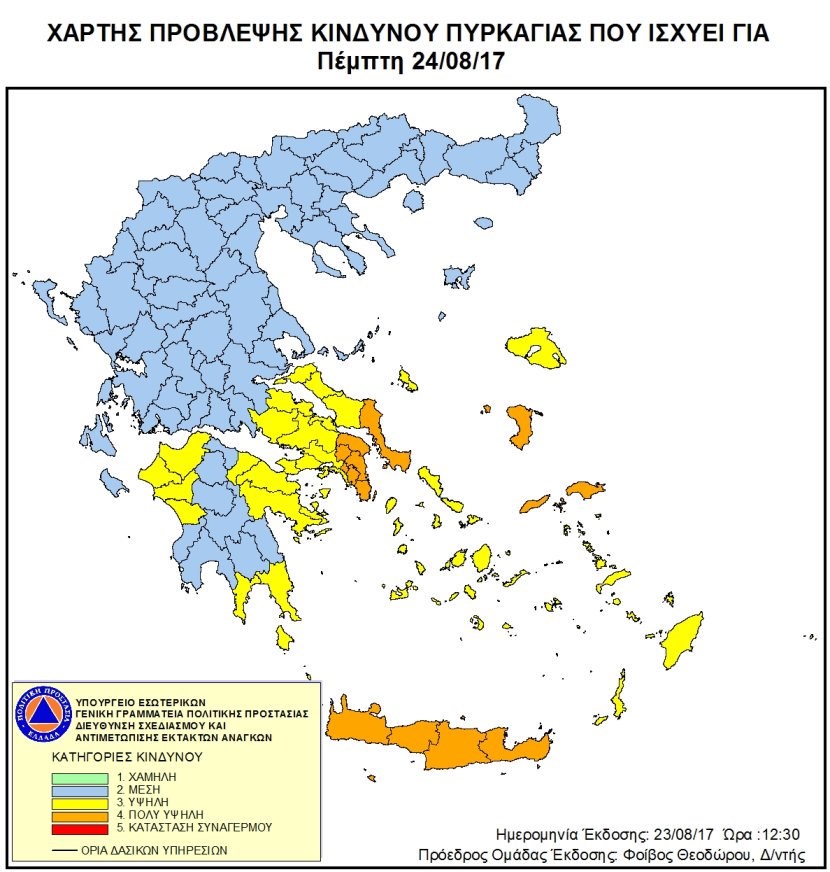 Εν τω μεταξύ, σήμερα ο κίνδυνος πυρκαγιάς είναι πολύ υψηλός («πορτοκαλί») σε Αττική, νότια Εύβοια, Χίο, Ικαρία, Σάμο και όλη την Κρήτη, ενώ υψηλός («κίτρινο») είναι ο κίνδυνος για Αχαΐα, Ηλεία, Κορινθία, Αργολίδα, Λακωνία, Βοιωτία, Φθιώτιδα, Βόρεια Εύβοια, Λέσβο, Κυκλάδες και Δωδεκάνησα.