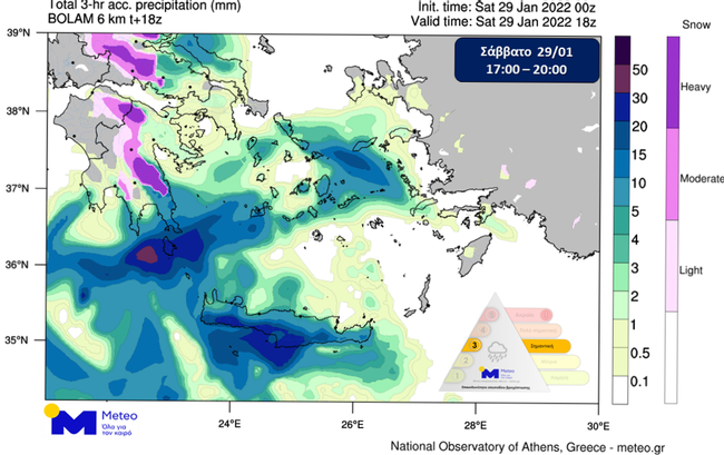 Σύμφωνα με τα προγνωστικά στοιχεία του Εθνικού Αστεροσκοπείου Αθηνών / Meteo.gr, τα φαινόμενα στα βόρεια σταδιακά θα εξασθενήσουν, ενώ από τις μεσημεριανές ώρες του Σαββάτου 29/01 θα επηρεάσουν βαθμιαία τα κεντρικά και νότια τμήματα της χώρας μας, με βροχές και καταιγίδες στις Κυκλάδες, στην Κρήτη, στην Πελοπόννησο, στα νησιά του Ανατολικού Αιγαίου και στα Δωδεκάνησα οι οποίες θα είναι ισχυρές, ιδιαίτερα τις βραδινές ώρες του Σαββάτου 29/01 και τις πρώτες πρωινές ώρες της Κυριακής 30/01, κατατάσσοντας την κακοκαιρία στην κατηγορία 3 του Δείκτη Επικινδυνότητας Βροχόπτωσης (Regional Precipitation Index – RPI).