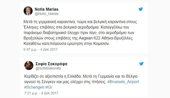 Μετά τη Γερμανία οι Έλληνες επιβάτες υπόκεινται σε εξονυχιστικούς ελέγχους και στο αεροδρόμιο των Βρυξελλών, όπως καταγγέλλουν Έλληνες ευρωβουλευτές με αναρτήσεις τους στα social media.Ο ευρωβουλευτής της ΝΔ Γιώργος Κύρτσος με ανάρτηση του στο Twitter κάνει λόγο για συνέχιση του «ευρωπαϊκού διασυρμού» της χώρας, ενώ κατηγόρησε την κυβέρνηση ότι αδυνατεί να ελέγξει «τα βιομηχανικής κλίμακας κυκλώματα παραγωγής πλαστών ταξιδιωτικών εγγράφων στην Ελλάδα».Ο Γιώργος Κύρτσος μίλησε και την Καθημερινή περιγράφοντας την εμπειρία που έζησε στις Βρυξέλλες. Σύμφωνα με τον ίδιο, το βράδυ της Δευτέρας ζητήθηκαν από τρεις αστυνομικούς τα ταξιδιωτικά έγγραφα επιβατών πτήσης της Aegean από την Αθήνα.Μαζί με τον κ. Κύρτσο στην πτήση ήταν και οι ευρωβουλευτές Σοφία Σακοράφα, Στέλιος Κούλογλου, Δημήτρης Παπαδημούλης, Νότης Μαριάς, Νίκος Ανδρουλάκης και Γιώργος Επιτήδειος.