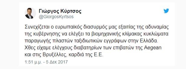 Μετά τη Γερμανία οι Έλληνες επιβάτες υπόκεινται σε εξονυχιστικούς ελέγχους και στο αεροδρόμιο των Βρυξελλών, όπως καταγγέλλουν Έλληνες ευρωβουλευτές με αναρτήσεις τους στα social media.Ο ευρωβουλευτής της ΝΔ Γιώργος Κύρτσος με ανάρτηση του στο Twitter κάνει λόγο για συνέχιση του «ευρωπαϊκού διασυρμού» της χώρας, ενώ κατηγόρησε την κυβέρνηση ότι αδυνατεί να ελέγξει «τα βιομηχανικής κλίμακας κυκλώματα παραγωγής πλαστών ταξιδιωτικών εγγράφων στην Ελλάδα».Ο Γιώργος Κύρτσος μίλησε και την Καθημερινή περιγράφοντας την εμπειρία που έζησε στις Βρυξέλλες. Σύμφωνα με τον ίδιο, το βράδυ της Δευτέρας ζητήθηκαν από τρεις αστυνομικούς τα ταξιδιωτικά έγγραφα επιβατών πτήσης της Aegean από την Αθήνα.Μαζί με τον κ. Κύρτσο στην πτήση ήταν και οι ευρωβουλευτές Σοφία Σακοράφα, Στέλιος Κούλογλου, Δημήτρης Παπαδημούλης, Νότης Μαριάς, Νίκος Ανδρουλάκης και Γιώργος Επιτήδειος.