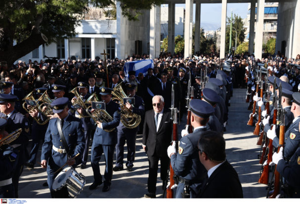 Υπό τον ήχο του πένθιμου εμβατηρίου που παιάνιζε η μπάντα της Αεροπορίας άφησαν λευκά τριαντάφυλλα και παρέλαβαν την ελληνική σημαία με την οποία ήταν σκεπασμένο το φέρετρό του.