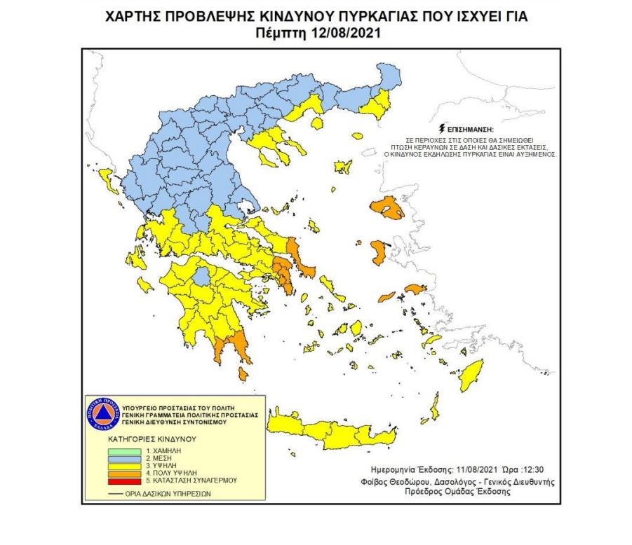 Πολύ υψηλός κίνδυνος πυρκαγιάς (κατηγορία κινδύνου 4) προβλέπεται σήμερα για τέσσερις Περιφέρειες της χώρας, σύμφωνα με το Χάρτη Πρόβλεψης Κινδύνου Πυρκαγιάς που εκδίδει η γενική γραμματεία Πολιτικής Προστασίας του υπουργείου Προστασίας του Πολίτη (www.civilprotection.gr)