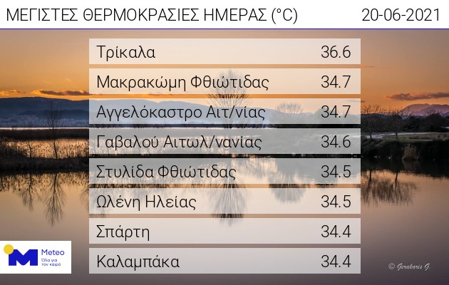 Σε πίνακα παρουσιάζονται οι 8 υψηλότερες μέγιστες θερμοκρασίες της Κυριακής, όπως καταγράφηκαν από το δίκτυο αυτόματων μετεωρολογικών σταθμών του Εθνικού Αστεροσκοπείου Αθηνών/meteo.gr.