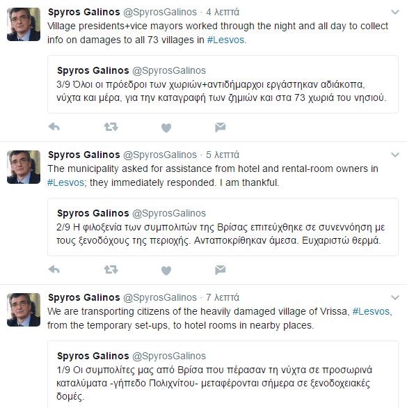 Ταυτόχρονα, ο κ. Γαληνός γνωστοποίησε στο Twitter ότι «όλοι οι πρόεδροι των χωριών και οι αντιδήμαρχοι εργάστηκαν αδιάκοπα, νύχτα και μέρα, για την καταγραφή των ζημιών και στα 73 χωριά του νησιού».