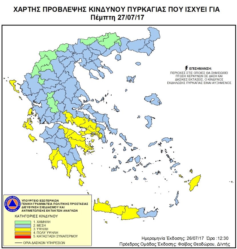 Σήμερα, σύμφωνα με τον Χάρτη Πρόβλεψης Κινδύνου Πυρκαγιάς, προβλέπεται υψηλός κίνδυνος (Δείκτης 3) για τους νομούς Αττικής, Βοιωτίας, Φωκίδας, Αργολίδας, Κορινθίας, Λακωνίας, Μεσσηνίας, Χανίων, Ρεθύμνου, Ηρακλείου, και για τα νησιά Λευκάδα, Ζάκυνθο, Κέρκυρα, Κεφαλονιά, Ιθάκη, Παξοί, Κύθηρα, Ρόδο, Σύμη, Τήλο και Χάλκη.