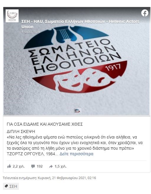 Ενημερώνουμε λοιπόν πως το θέατρο δεν έχει καμία ανάγκη, ούτε από το Σωματείο Ελλήνων Ηθοποιών, ούτε από κανέναν να υπερασπιστεί την υπόληψη του ως Τέχνης στην κοινή γνώμη της ίδιας της χώρας που το γέννησε πριν 2500 χρόνια. Ποτέ ως τώρα, κάποια εγκληματική ενέργεια ή η συγκάλυψή της, κάποια σκευωρία, κάποιος πολιτικός σχεδιασμός, κάποια ατάκα επικοινωνιολόγου και κάποια πολιτική διγλωσσία (που επιβάλει άλλο νόημα στις λέξεις που ο όποιος ομιλητής χρησιμοποιεί) δεν μπόρεσε να το σπιλώσει. Ούτε το θέατρο, ούτε τους ηθοποιούς του: από τον πρώτο “Υποκριτή”, τον Θέσπι, μέχρι σήμερα, αυτή η χώρα έχει ευλογηθεί από μεγάλες προσωπικότητες ηθοποιών που ενέπνευσαν και άνοιξαν δρόμο όχι μόνο για τους επόμενους, αλλά και για την κοινωνία ολόκληρη.