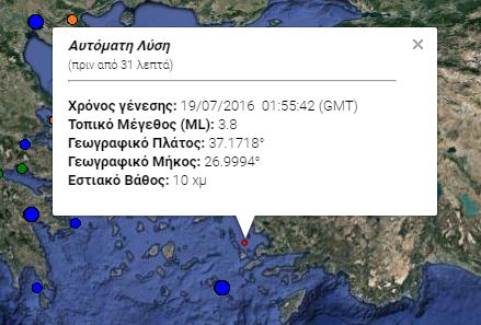 Σύμφωνα με την αυτόματη, προκαταρκτική λύση του Γεωδυναμικού Ινστιτούτου του Αστεροσκοπείου Αθηνών, η δόνηση σημειώθηκε στις 4.55 τα ξημερώματα της Τρίτης. Ήταν 3,8 βαθμών της κλίμακας Ρίχτερ σε εστιακό υποθαλάσσιο βάθος 10 χιλιομέτρων.