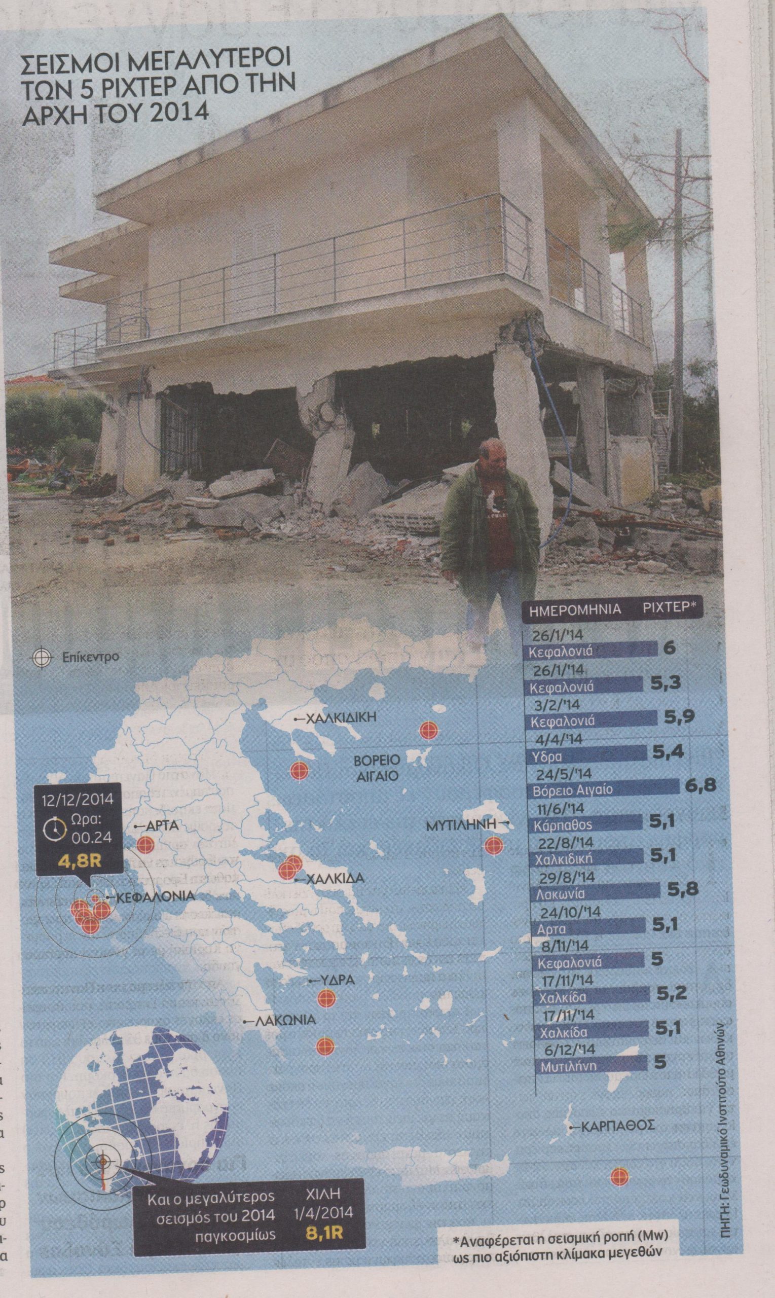 Ένας σεισμός ισχυρότερος των 5 Ρίχτερ εκδηλωνόταν σχεδόν κάθε μήνα στην Ελλάδα το 2014. Ήταν μία χρονιά σεισμικής έξαρσης για τη χώρα μας, αφού κατά τη διάρκειά της ο Εγκέλαδος έκανε αρκετά συχνά την εμφάνισή του σε σχέση με το κοντινό παρελθόν, ενώ ενίοτε έδειχνε τις «διαθέσεις» του με μεγάλα μεγέθη σεισμών.