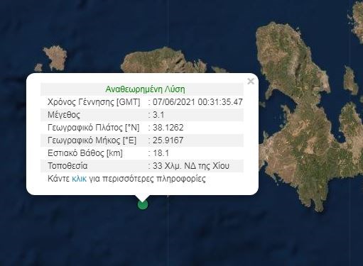 Σεισμική δόνηση 3,1 βαθμών της κλίμακας Ρίχτερ σημειώθηκε τα ξημερώματα της Δευτέρας 7 Ιουνίου 2021 στη Χίο. Σύμφωνα με το Γεωδυναμικό Ινστιτούτο του Εθνικού Αστεροσκοπείου Αθηνών, το επίκεντρο του σεισμού εντοπίζεται 33 χιλιόμετρα νοτιοδυτικά της Χίου και το εστιακό βάθος υπολογίζεται στα 18,1 χιλιόμετρα.