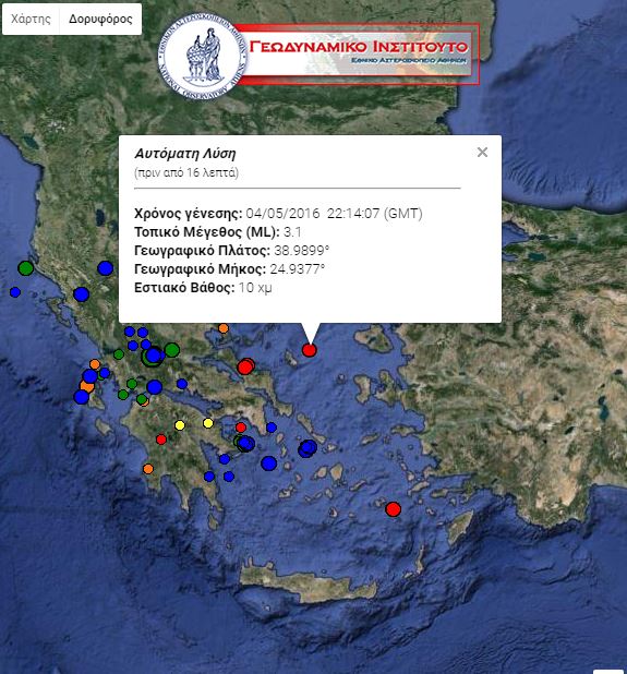 Σεισμική δόνηση εντάσεως 3,1 Ρίχτερ, σημειώθηκε πριν από λίγη ώρα 33 χιλιόμετρα βορειοανατολικά της Σκύρου, σύμφωνα με την αυτόματη μέτρηση του Γεωδυναμικού.