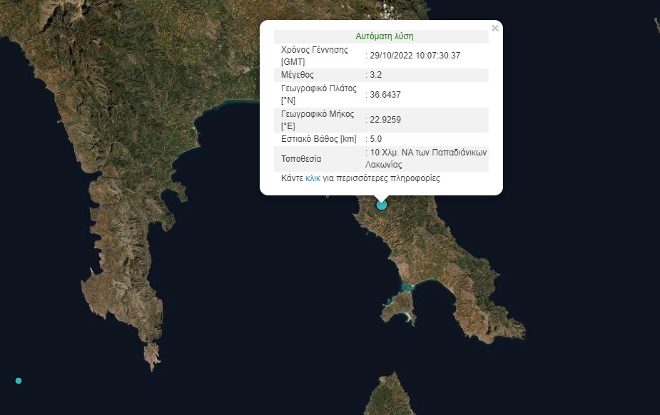 Σεισμός μεγέθους 3,2 βαθμών της κλίμακας Ρίχτερ σημειώθηκε το μεσημέρι του Σαββάτου 29 Οκτωβρίου στη Λακωνία. Σύμφωνα με το Γεωδυναμικό Ινστιτούτο, το επίκεντρο της σεισμικής δόνησης εντοπίζεται σε περιοχή που βρίσκεται 10 χλμ νοτιοανατολικά από τα Παπαδιάνικα Λακωνίας.