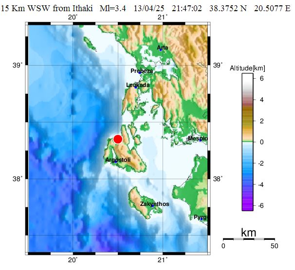 Σεισμός εντάσεως 3,4 βαθμών της κλίμακας Ρίχτερ σημειώθηκε στις 00.47 τα ξημερώματα σε θαλάσσιο χώρο δυτικά νοτιοδυτικά της Ιθάκης.
