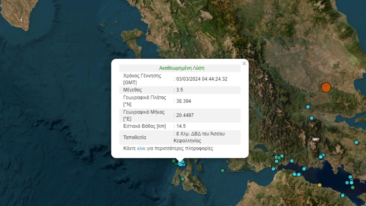 Σεισμός μεγέθους 3,5 βαθμών της κλίμακας Ρίχτερ σημειώθηκε το πρωί της Κυριακής 3 Μαρτίου, ανοιχτά της Κεφαλονιάς.