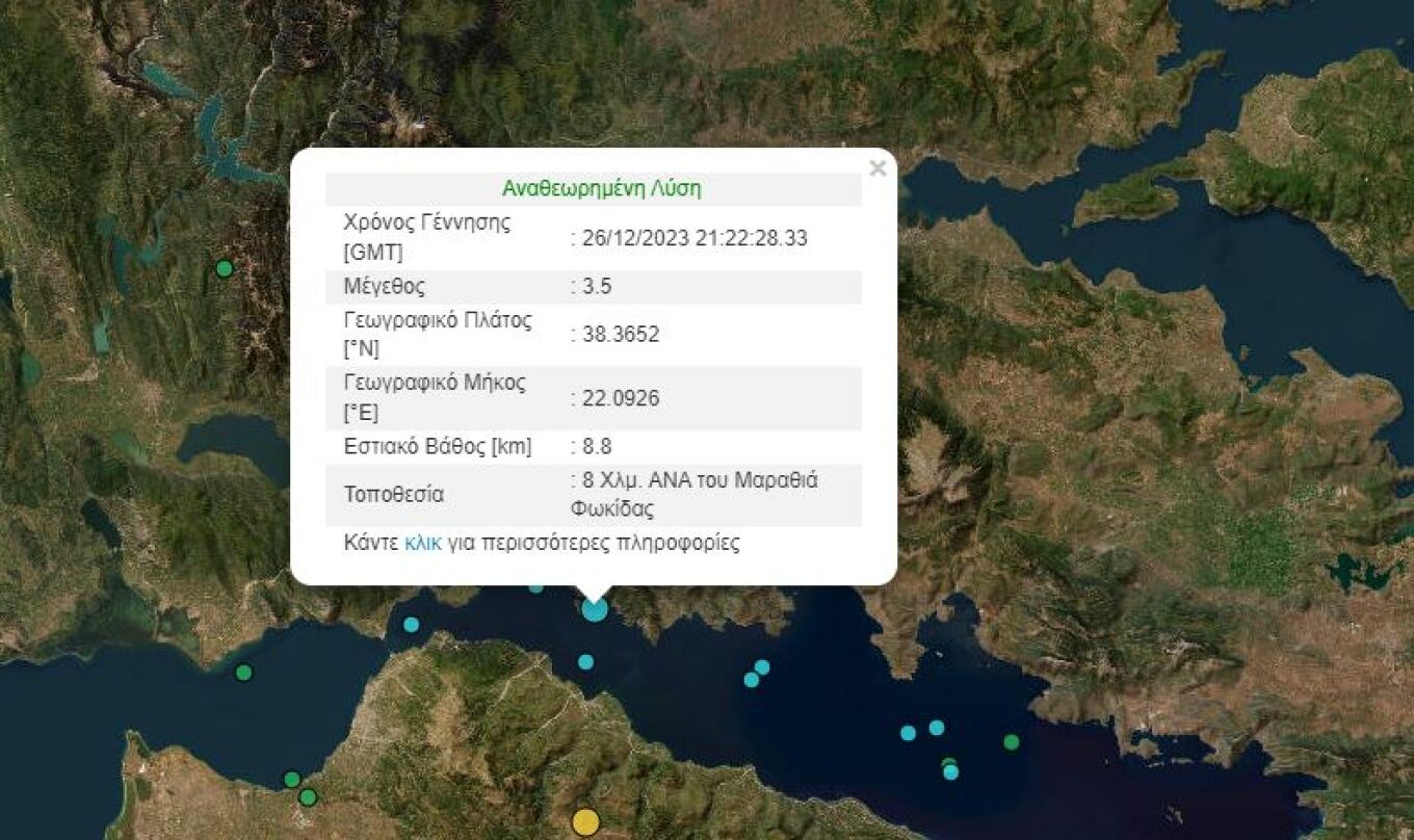 Σεισμική δόνηση 3,5 Ρίχτερ σημειώθηκε στις 23:22 της Τρίτης (26/12) στη Φωκίδα.