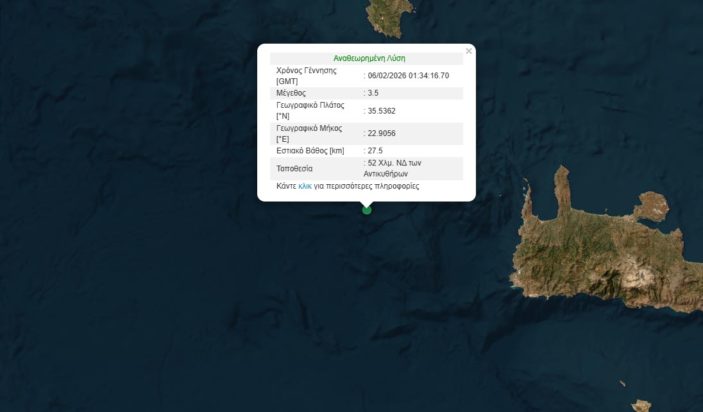 Σεισμός μεγέθους 3,5 βαθμών της κλίμακας Ρίχτερ σημειώθηκε τα ξημερώματα στη θαλάσσια περιοχή μεταξύ Κρήτης και Αντικυθήρων.