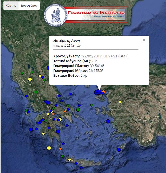 Σεισμική δόνηση μεγέθους 3,5 βαθμών της κλίμακας Ρίχτερ σημειώθηκε στις 03:24 τα ξημερώματα της Τετάρτης, βορειοδυτικά της Λέσβου.
