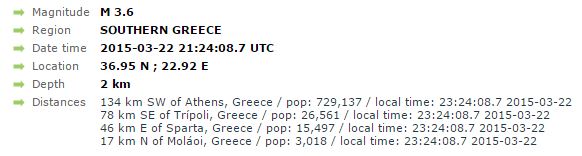 Σύμφωνα με τις εκτιμήσεις του Γεωδυναμικό Ινστιτούτο Αθηνών, η σεισμική δόνηση 3,5 βαθμών της κλίμακας Ρίχτερ είχε επίκεντρο 49 χιλιόμετρα βόρεια της Νεάπολης Βοιών στη Λακωνία.