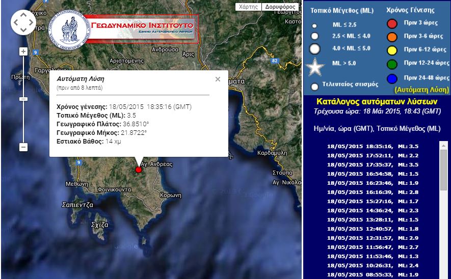 Ασθενής σεισμική δόνηση, εντάσεως 3,5 Ρίχτερ, σημειώθηκε πριν από λίγα λεπτά στη νότια Πελοπόννησο, 17 χιλιόμετρα ανατολικά-νοτιοανατολικά της Πύλου, κοντά στην Κορώνη.