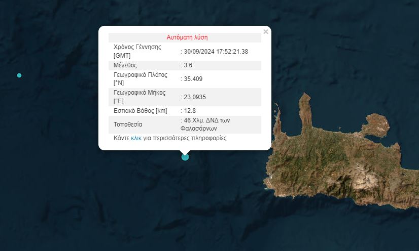 Σεισμός 3,6 βαθμών της κλίμακας Ρίχτερ σημειώθηκε το απόγευμα της Δευτέρας (29/09), ανοιχτά της Κρήτης.