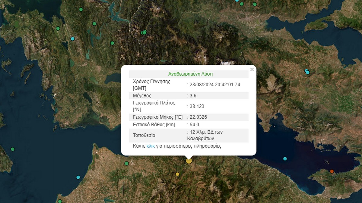 Σύμφωνα με το Γεωδυναμικό Ινστιτούτο το επίκεντρο της δόνησης εντοπίζεται στα 12χλμ. βορειοδυτικά των Καλαβρύτων, ενώ το εστιακό βάθος υπολογίζεται στα 54χλμ.