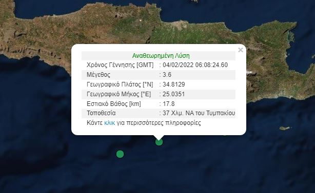 Σύμφωνα με το Γεωδυναμικό Ινστιτούτο, ο σεισμός ήταν μεγέθους 3,6 βαθμών της κλίμακας Ρίχτερ και το επίκεντρο ήταν ανοιχτά από το Τυμπάκι, σε θαλάσσια περιοχή.