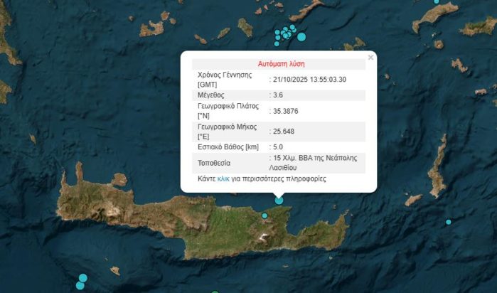 Σεισμός 3,6 βαθμών της κλίμακας Ρίχτερ σημειώθηκε το μεσημέρι της Τρίτης (21/10) στην Κρήτη και συγκεκριμένα στο Λασίθι.