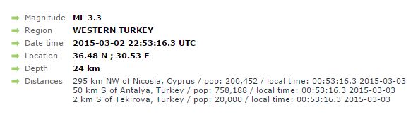 Σύμφωνα με τις εκτιμήσεις του Γεωδυναμικό Ινστιτούτο Αθηνών, η σεισμική δόνηση 3,6 βαθμών της κλίμακας Ρίχτερ είχε επίκεντρο στη δυτική Τουρκία, περίπου 178 χιλιόμετρα ανατολικά της Ρόδου.