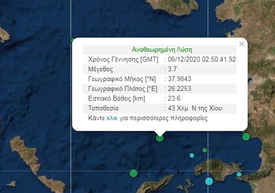 Σεισμική δόνηση μεγέθους 3,7 βαθμών της κλίμακας Ρίχτερ σημειώθηκε τα ξημερώματα της Κυριακής νότια της Χίου. Σύμφωνα με το Γεωδυναμικό Ινστιτούτο Αθηνών, το επίκεντρο του σεισμού εντοπίστηκε στα 43 χιλιόμετρα νότια της Χίου, ενώ είχε εστιακό βάθος 23,6 χιλιομέτρων.