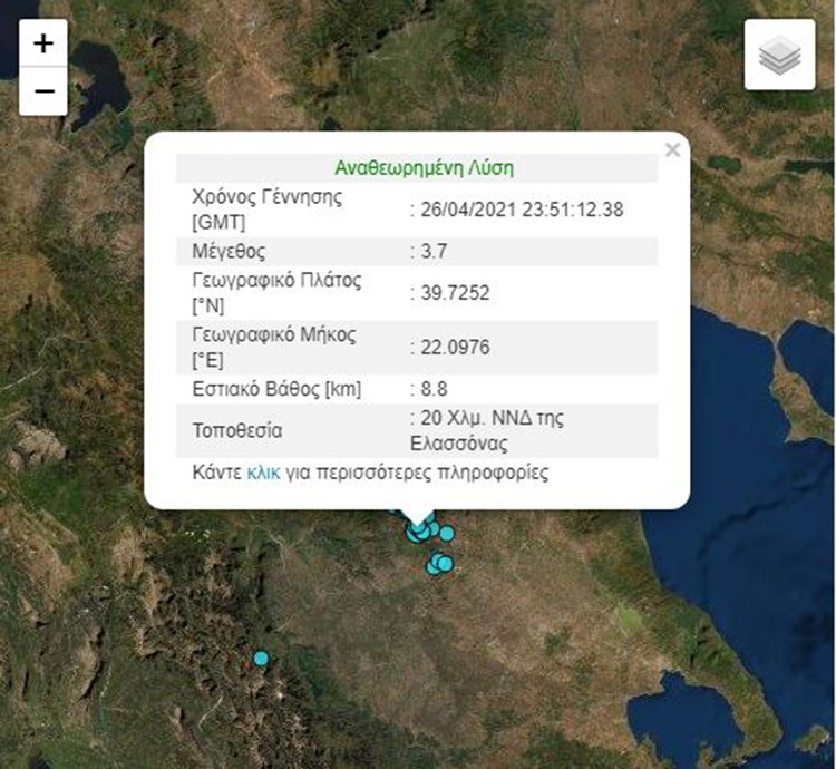 Το εστιακό βάθος υπολογίζεται στα 8,8 χλμ., σύμφωνα με το Γεωδυναμικό Ινστιτούτο, ενώ το επίκεντρο εντοπίζεται 20 χλμ. νότια νοτιοδυτικά της Ελασσόνας.