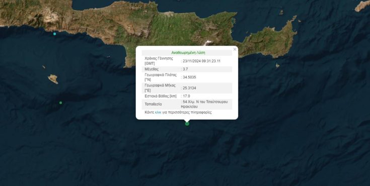 Σεισμός 3,7 της κλίμακας Ρίχτερ σημειώθηκε το πρωί του Σαββάτου (23/11), ανατολικά του Ηρακλείου Κρήτης.