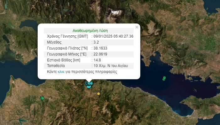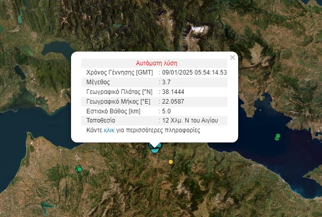 Σύμφωνα με το Γεωδυναμικό Ινστιτούτο Αθηνών, το επίκεντρο του σεισμού εντοπίζεται 12 χιλιόμετρα νότια του Αιγίου.