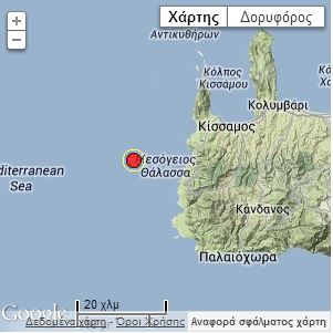 Σύμφωνα με προκαταρκτική μέτρηση του Γεωδυναμικού Ινστιτούτου του Εθνικού Αστεροσκοπείου Αθηνών, η δόνηση σημειώθηκε στις 23:55 στη θαλάσσια περιοχή δυτικά της Κρήτης.
