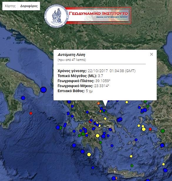 Σεισμική δόνηση μεγέθους 3,7 βαθμών της κλίμακας Ρίχτερ σημειώθηκε στις 04:34 τα ξημερώματα στη θαλάσσια περιοχή 18 χιλιόμετρα ανατολικά της περιοχής Τρίκερι Μαγνησίας.