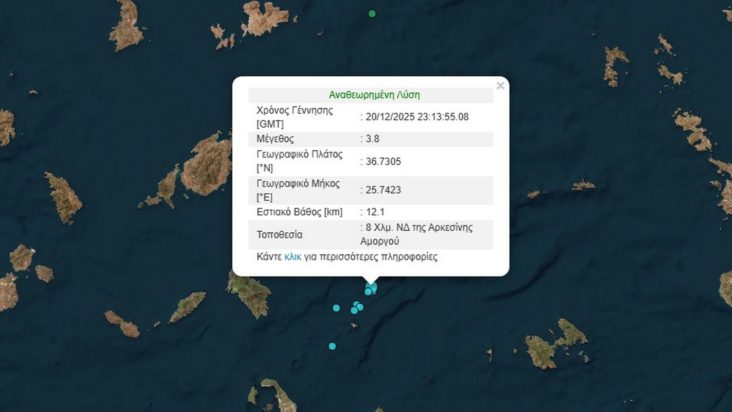 Σεισμός μεγέθους 3,8 βαθμών της κλίμακας Ρίχτερ σημειώθηκε στις 01:13, μεταξύ Σαντορίνης και Αμοργού.