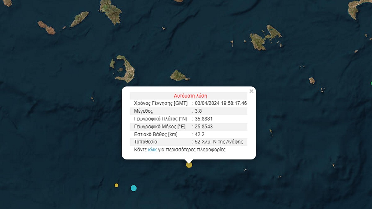Σεισμός μεγέθους 3,8 βαθμών της κλίμακας Ρίχτερ σημειώθηκε το βράδυ της Τετάρτης 3 Απριλίου ανοιχτά της Ανάφης.
