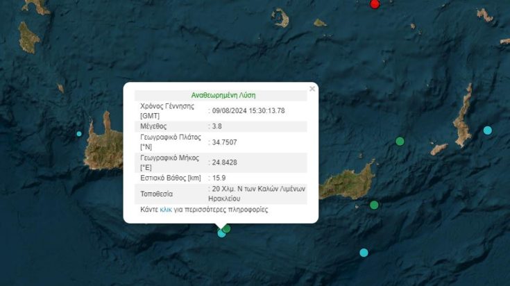 Σεισμός έντασης 3,8 βαθμών της κλίμακας Ρίχτερ σημειώθηκε το απόγευμα της Παρασκευής (9/8) στη θαλάσσια περιοχή νότια της Κρήτης.