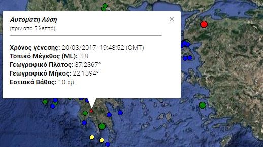 Σεισμική δόνηση μεγέθους 3,8 βαθμών της κλίμακας Ρίχτερ σημειώθηκε στις 21.48 στην Καλαμάτα.Σύμφωνα με την αυτόματη, προκαταρκτική λύση του Γεωδυναμικού Ινστιτούτου, η δόνηση σημειώθηκε στις 21:48:52 σε εστιακό βάθος 10 χιλιομέτρων. Όσο για το επίκεντρο του σεισμού, εντοπίστηκε 21 χιλιόμετρα βόρεια της Καλαμάτας.