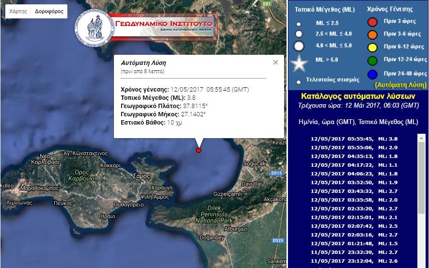 Σεισμική δόνηση 3,8 Ρίχτερ έγινε το πρωί της Παρασκευής στη θαλάσσια περιοχή ανοιχτά της Σάμου.
