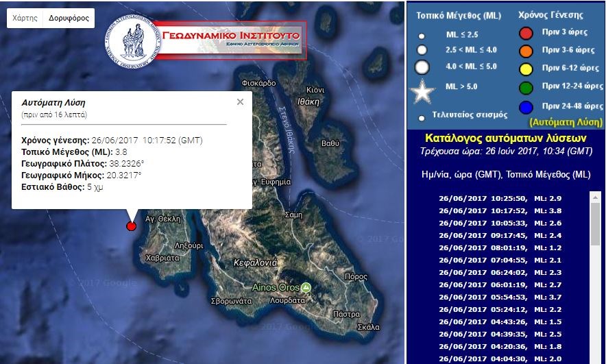Σεισμός 3,8 Ρίχτερ έγινε στην Κεφαλονιά. Σύμφωνα με την αυτόματη, προκαταρκτική λύση του Γεωδυναμικού Ινστιτούτου, η σεισμική δόνηση εκδηλώθηκε στις 13:17.