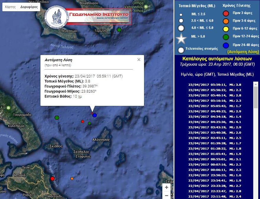 Σεισμός 3,8 Ρίχτερ έγινε στις 8:59 στη θαλάσσια περιοχή βόρεια της Αλοννήσου.Σύμφωνα με την αυτόματη, προκαταρκτική μέτρηση του Γεωδυναμικού, η σεισμική δόνηση είχε επίκεντρο 28 χλμ. βόρεια της Αλοννήσου, ενώ το εστιακό βάθος υπολογίστηκε στα 10 χιλιόμετρα.