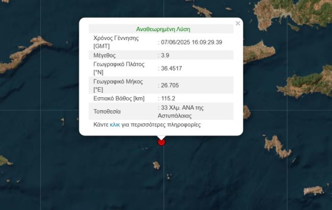 Σεισμός 3,9 Ρίχτερ σημειώθηκε το απόγευμα του Σαββάτου (07/06), ανοιχτά της Αστυπάλαιας.