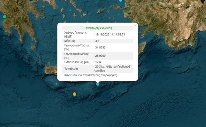 Σεισμός 3,8 βαθμών της κλίμακας Ρίχτερ σημειώθηκε πριν από λίγο στη θαλάσσια περιοχή νότια του Λασιθίου, στην Κρήτη.