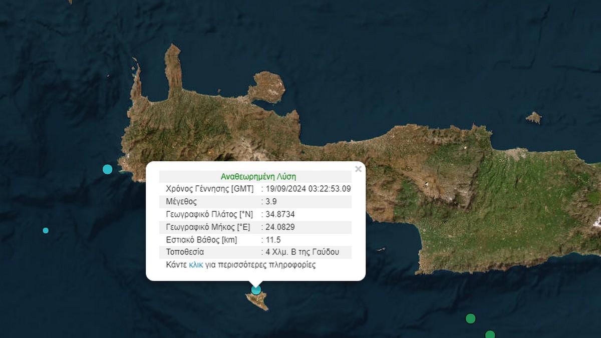 Σεισμός μεγέθους 3,8 βαθμών της Κλίμακας Ρίχτερ σημειώθηκε τα ξημερώματα της Πέμπτης 19 Σεπτεμβρίου στη Γαύδο.