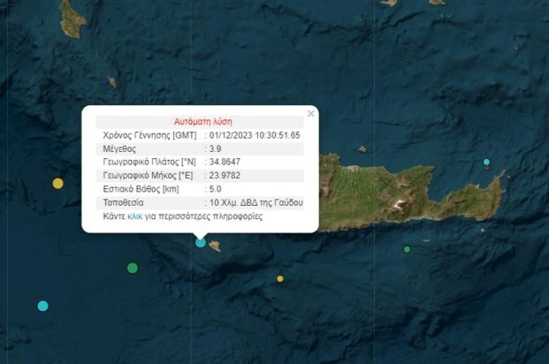 Σεισμός έντασης 3,9 βαθμών της κλίμακας Ρίχτερ σημειώθηκε πριν από λίγο στη θαλάσσια περιοχή ανοιχτά της Γαύδου.